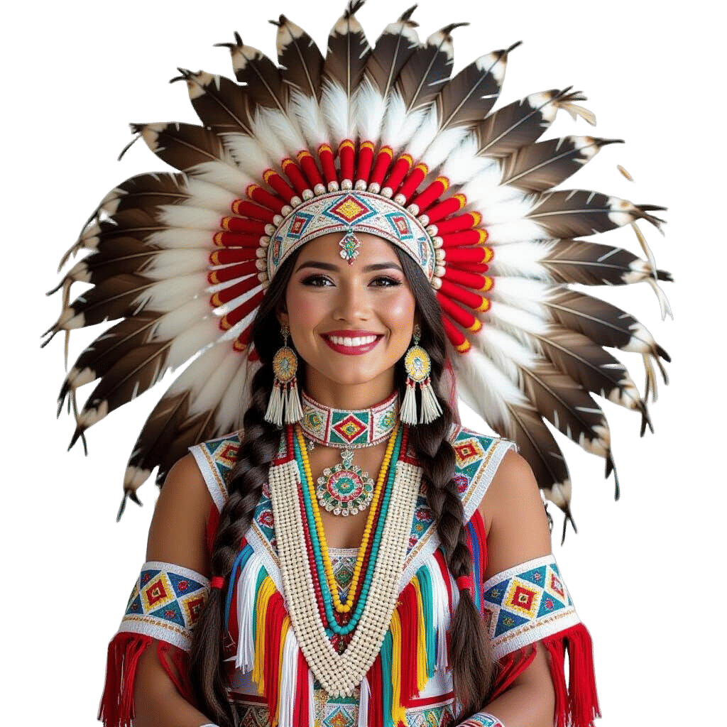 This image depicts a Native American woman adorned in ceremonial clothing. The vibrant colors and rich ornamentation of beads and feathers blend traditional Indigenous elements with a modern aesthetic.