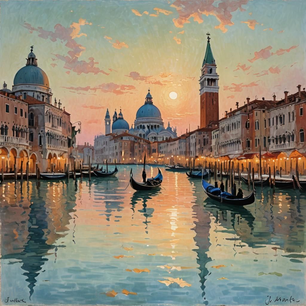 This image shows gondolas floating on the tranquil Venetian Lagoon at dawn. Soft brushstrokes and luminous pastel colors capture the serene beauty of Venice.
