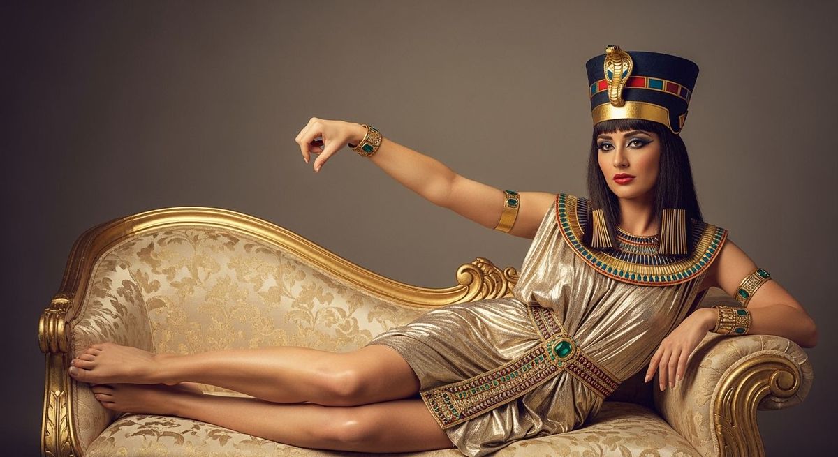 This image shows an Egyptian queen casually reclining on a chaise lounge. She is wearing a gold and emerald toga and cobra crown. The photograph features soft bokeh and warm lighting.