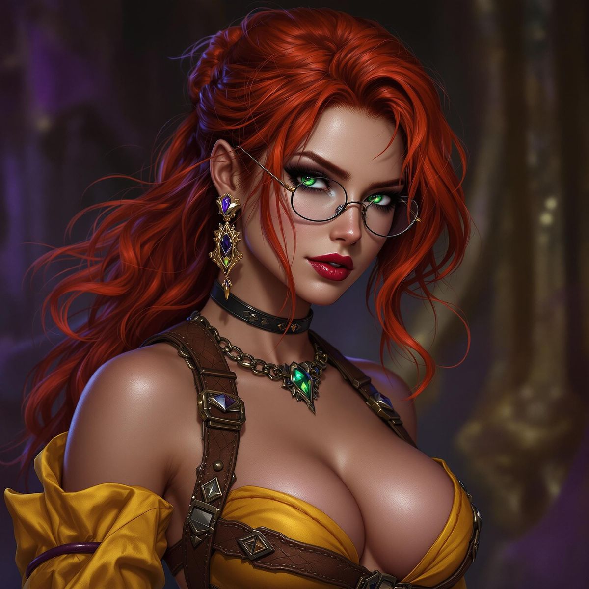 A striking picture of a muscular red-haired woman with green eyes wearing an elaborate leather harness. The art features dynamic lighting and a rich color palette in a dark fantasy aesthetic.