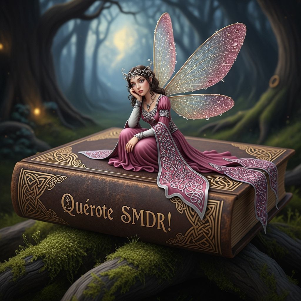 This image shows a diminutive, ethereal woman with dragonfly wings in a Celtic dress, reminiscent of fairy art. She is perched on an ancient book in a twilight forest, rendered with a melancholic, dreamlike aesthetic.
