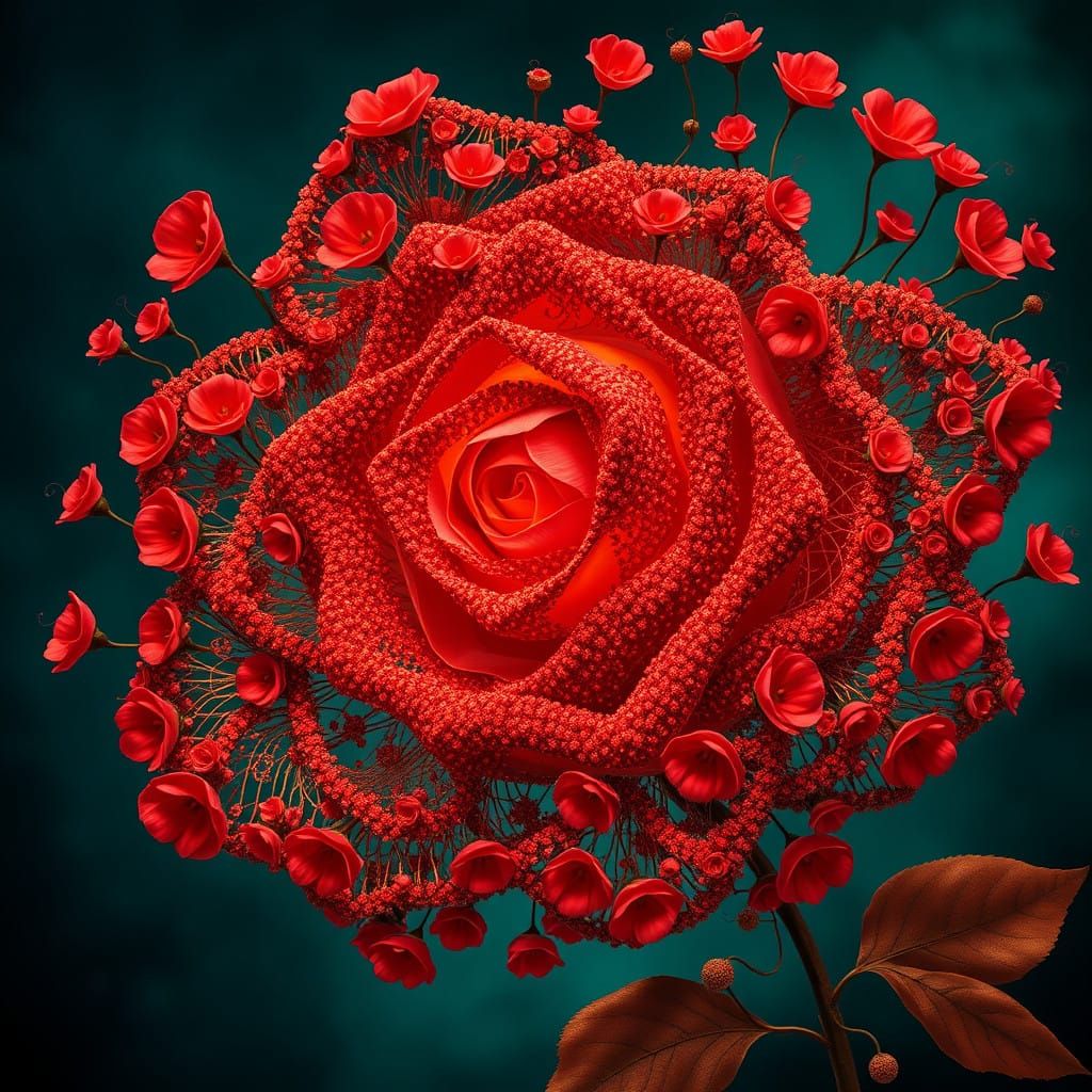 This image showcases a colossal rose formed from countless small red flowers, arranged in a fluid pattern. Set against a deep blue-green backdrop, it's rendered in a detailed matte painting style with saturated colors and intricate textures.