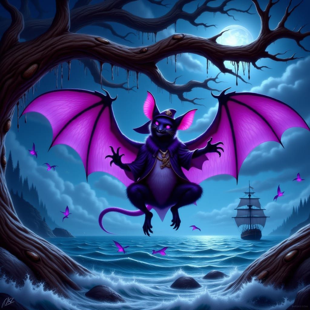 A purple bat in a pirate hat hangs from a branch over a misty ocean with a sailing ship. Digital painting in a gothic, whimsical style with deep colors.