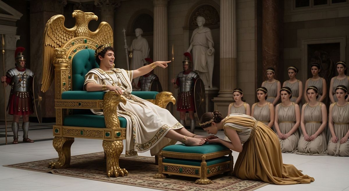 This image depicts Emperor Nero lounging on an opulent throne as priestesses kneel before him. The photograph captures the extravagance of the Roman court with its gold, emeralds, and marble.