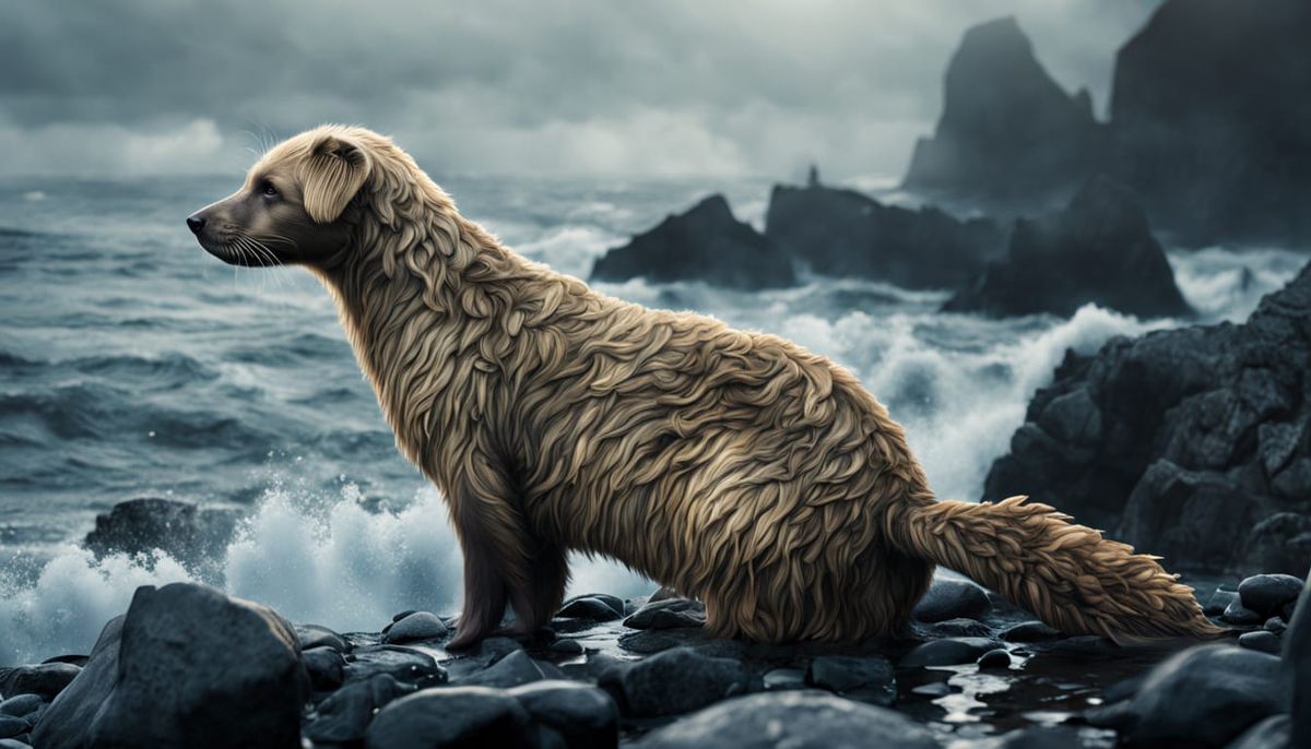 A striking picture of a selkie on a rocky shore, reminiscent of atmospheric cinematic photography. Seaweed adorns her tail, with golden light and misty ocean spray adding to the moody scene. High contrast and sharp focus.