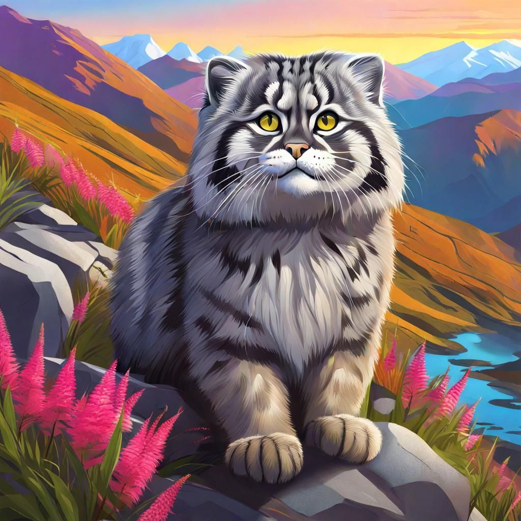 A digital illustration of an adorable Pallas cat in a mountain setting, its round reflective eyes are striking. The art style is whimsical, colorful, and highly detailed.