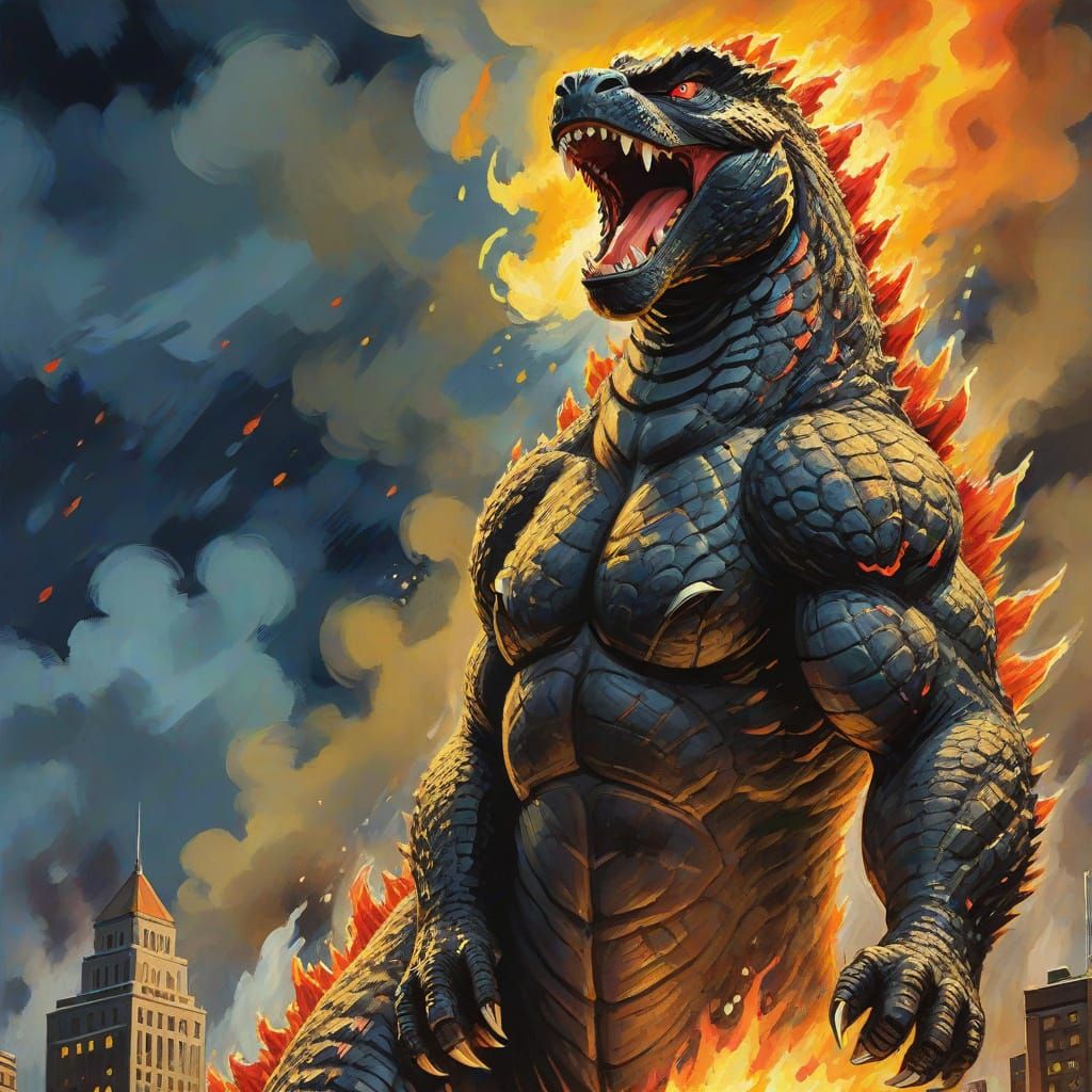 A vibrant gouache painting of Godzilla roaring in a city. The cinematic artwork features a scaly texture, flames illuminating the dark sky, and warm golden lighting in an expressionist style.