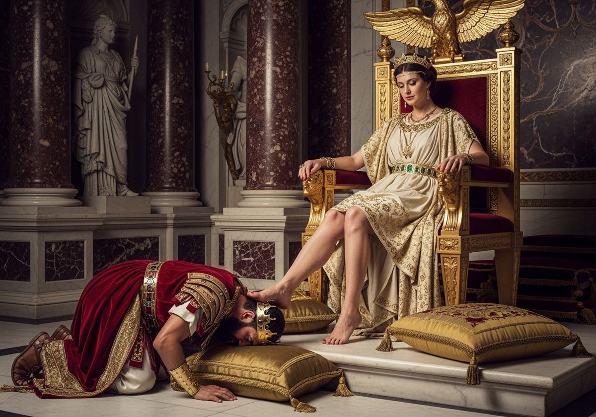 This image shows Empress Messalina on a gold throne, pressing her foot on a kneeling king. The opulent throne room scene is rendered in a baroque style with rich detail and dramatic lighting.