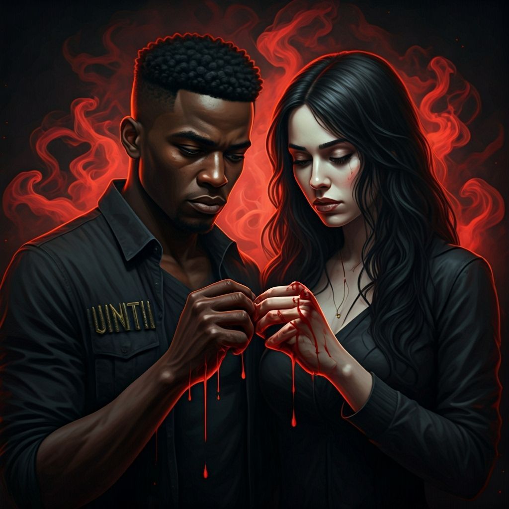A striking image of a couple holding bleeding hearts, surrounded by red smoke and bullet-formed text. This powerful visual explores themes of love and mortality.