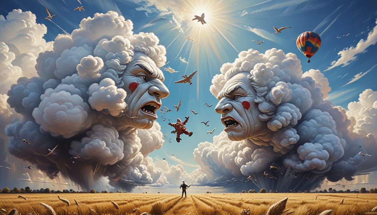 A vibrant digital artwork in the style of an oil painting, featuring two cloud wrestlers facing off in a whimsical, dreamlike sky. Birds, airplanes, and hot air balloons cheer them on.