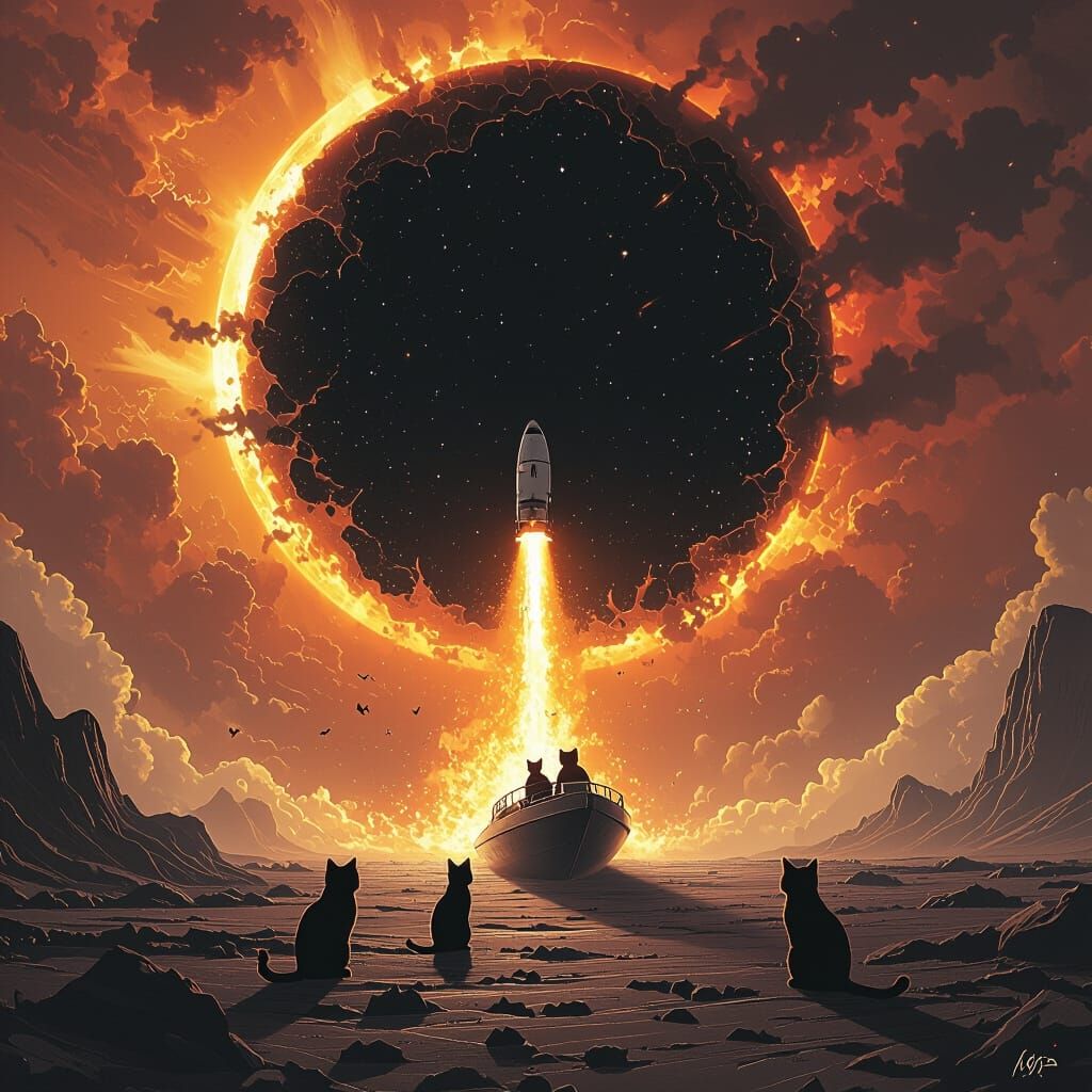 This image shows a burning spaceship piloted by cats as it's consumed by a black hole. The background features a blazing sun, rendered with dark, atmospheric textures.