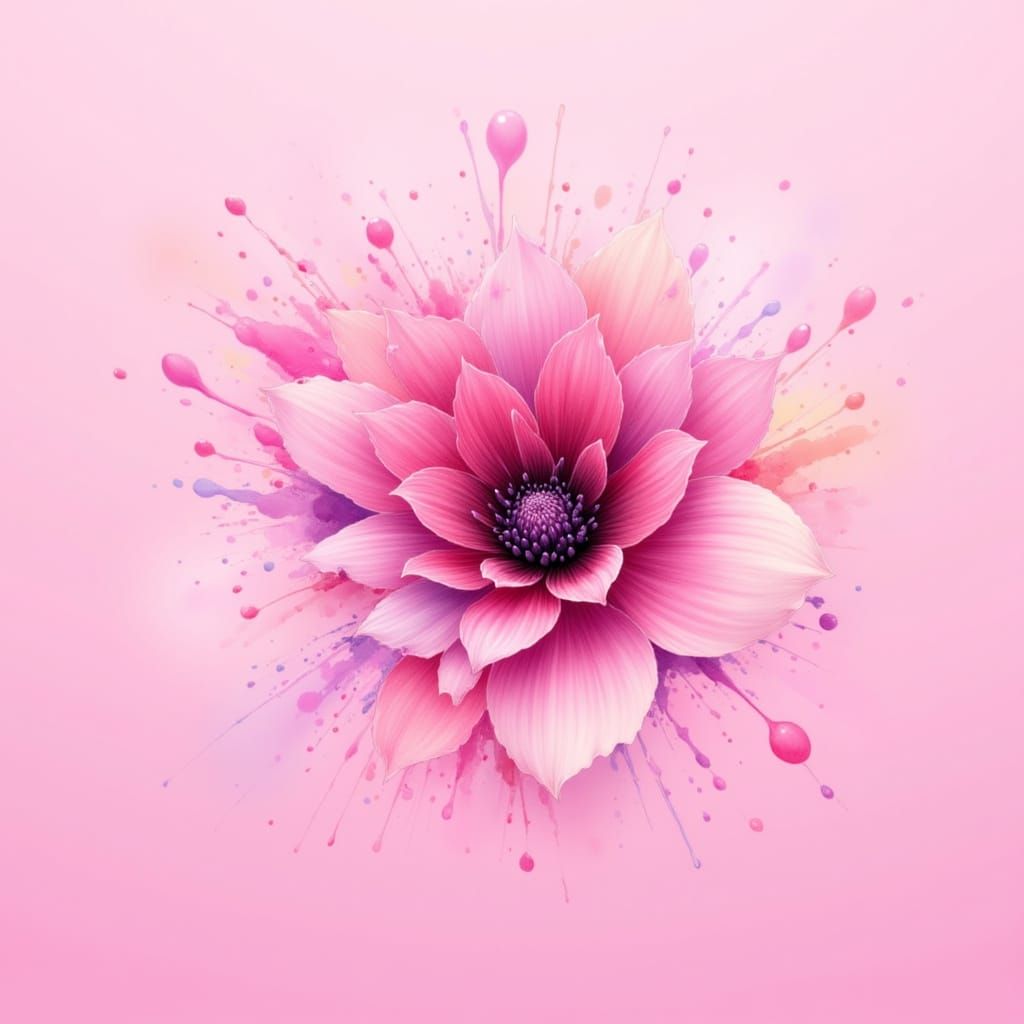 This image displays a beautiful flower with pastel colors, set against a pink background with vibrant pink and purple splash art effects. Rendered with OptiX for a polished finish.