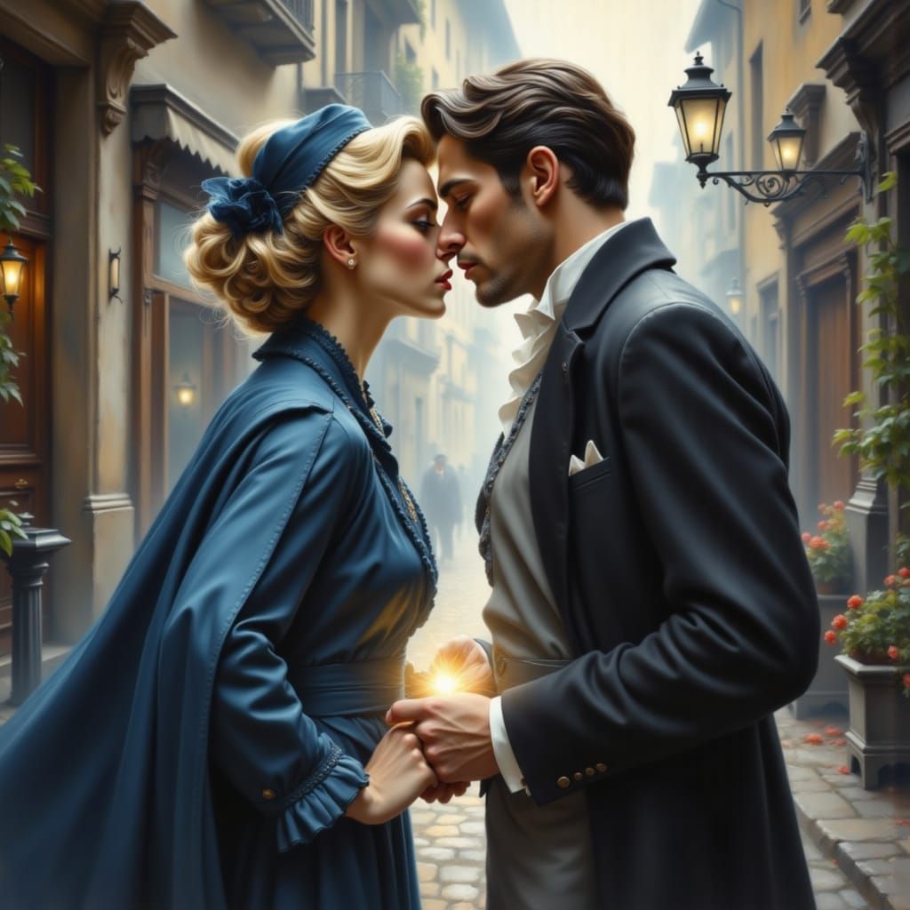 This image shows a detailed split-screen scene: a 1945 woman in vintage attire on the left, and a 2026 man in casual wear on the right, meeting in a passionate kiss. Rendered in cinematic photorealism.