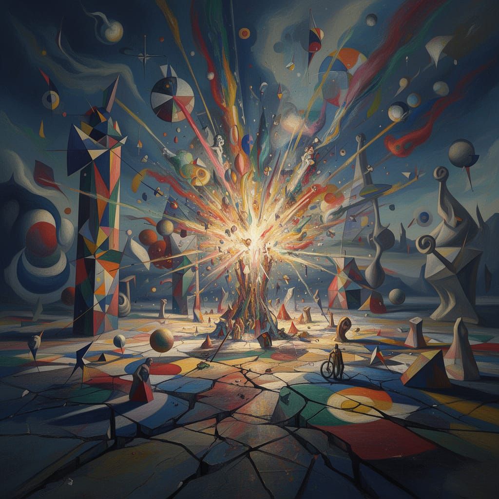 This hyperrealistic image features broken lines and clashing colors, creating a surreal utopia of art and avant-garde expression. Cinematic lighting and vivid colors define its chaotic beauty.