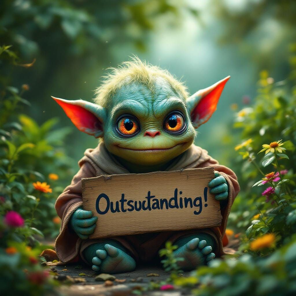 A vibrant fantasy image of an earth elemental baby ogre holding a sign. The intricate details and deep colors create a lush and captivating scene, rendered as concept art.