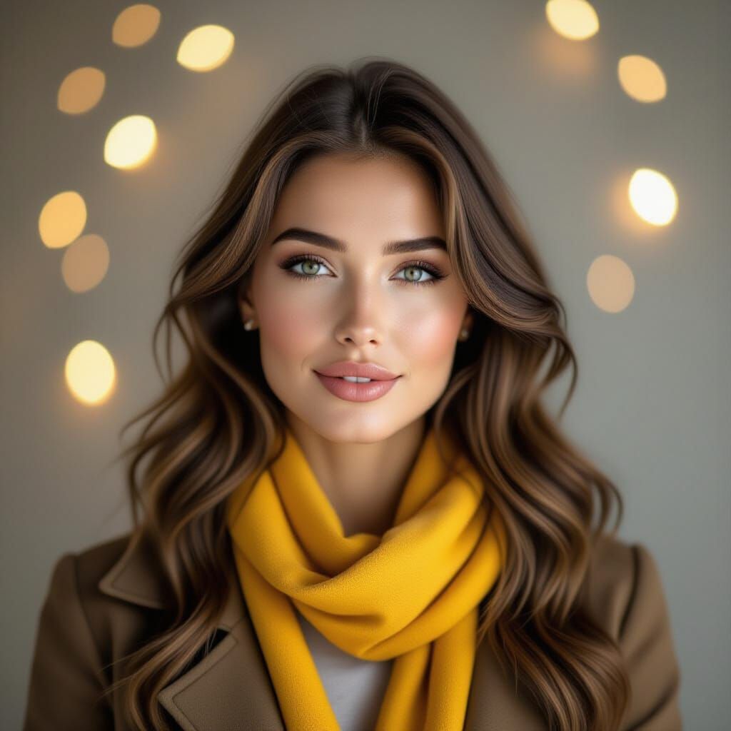This photorealistic portrait features an elegant redhead with long, straight hair, wearing a brown jacket and yellow scarf. Soft studio lighting highlights her features against a blurred background, creating a refined atmosphere.