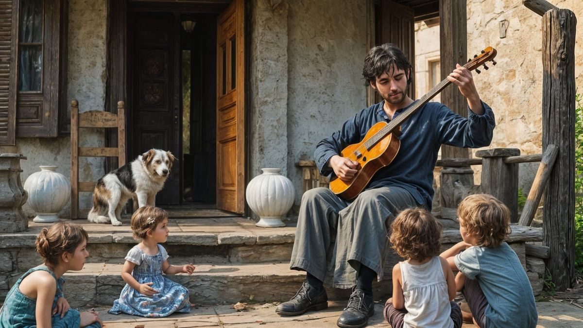 This gouache and watercolor painting depicts Eastern European individuals in traditional gypsy attire, playing fiddle with children listening. Features thick brush strokes and a maximalist aesthetic.