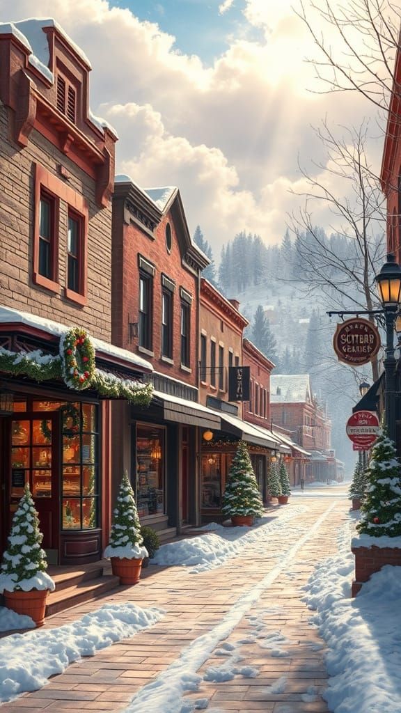 This serene painting depicts Flagstaff's quaint old town, filled with festive charm as a Christmas shop bursts with vibrant decorations, set against a snowy backdrop illuminated by soft, divine light