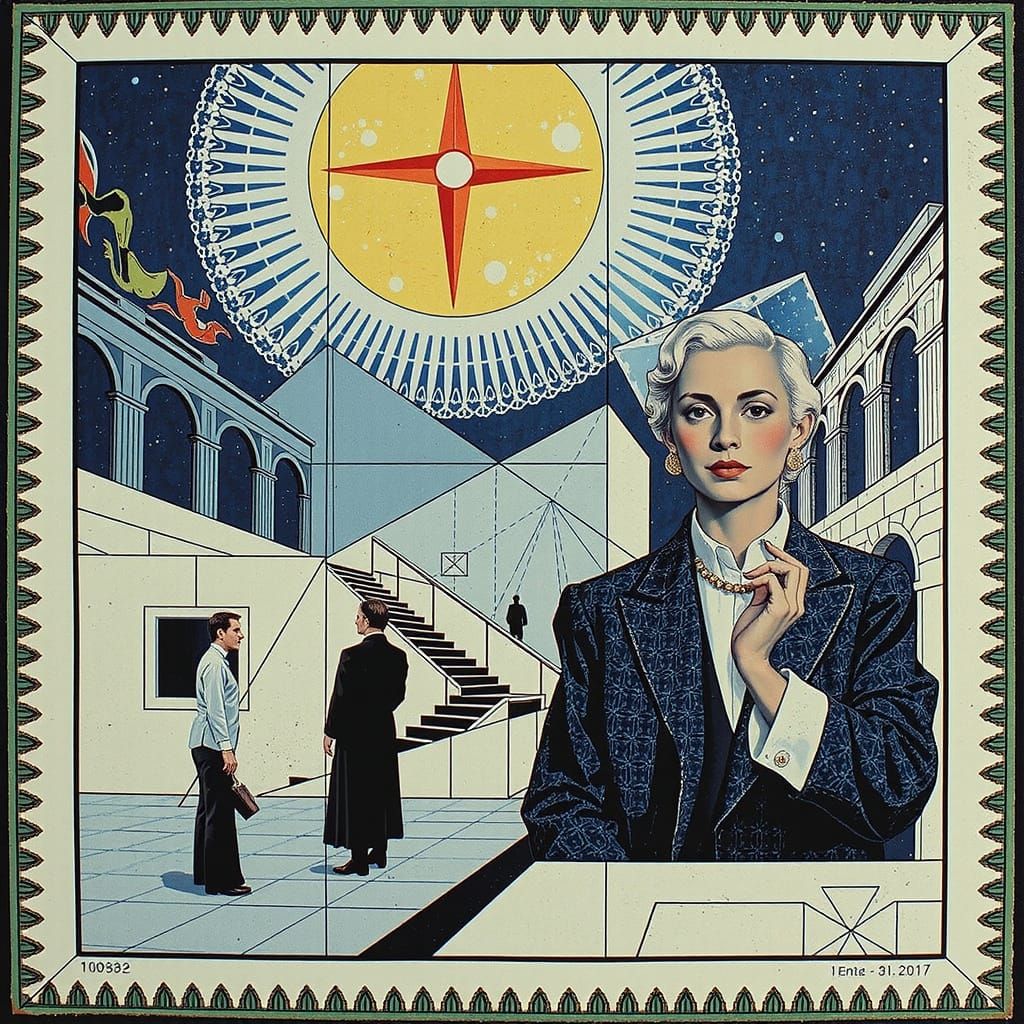 A visually stunning image showcasing geometric precision and vibrant colors. The artwork blends Art Deco, paper art, and glitch art elements to create captivating optical illusions.