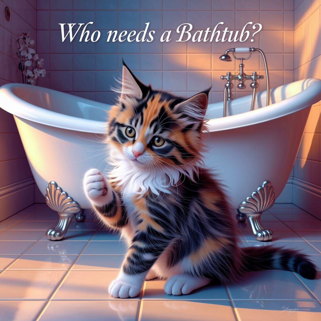 A charming oil-painted scene of a fluffy calico kitten cleaning its paw in a whimsical bathroom, with a giant bathtub and warm golden light, evoking the style of James Gurney's work.