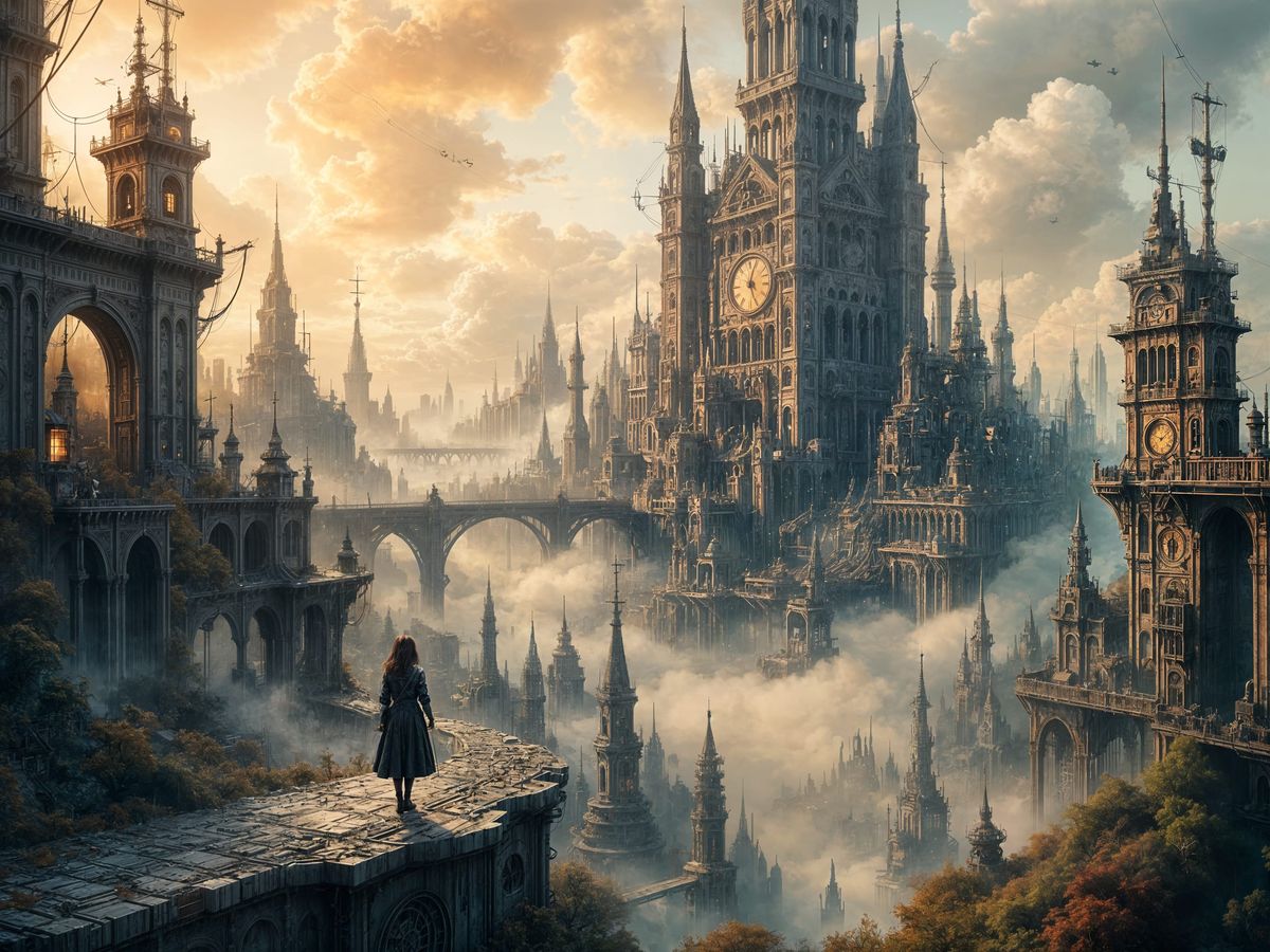 This image depicts a young girl in a post-apocalyptic steampunk city. The complex cityscape features towering skyscrapers and intricate electrical wiring, rendered during magic hour.