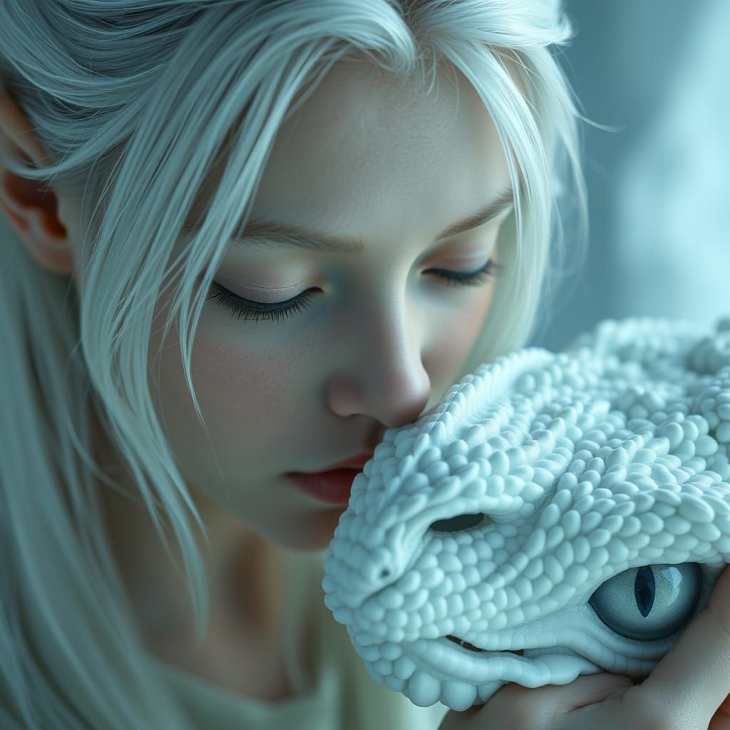 A striking picture of an elf-like woman with white hair, her face against a white dragon's snout. The image features hyperrealism, soft shadows, and a cool, ethereal color palette.