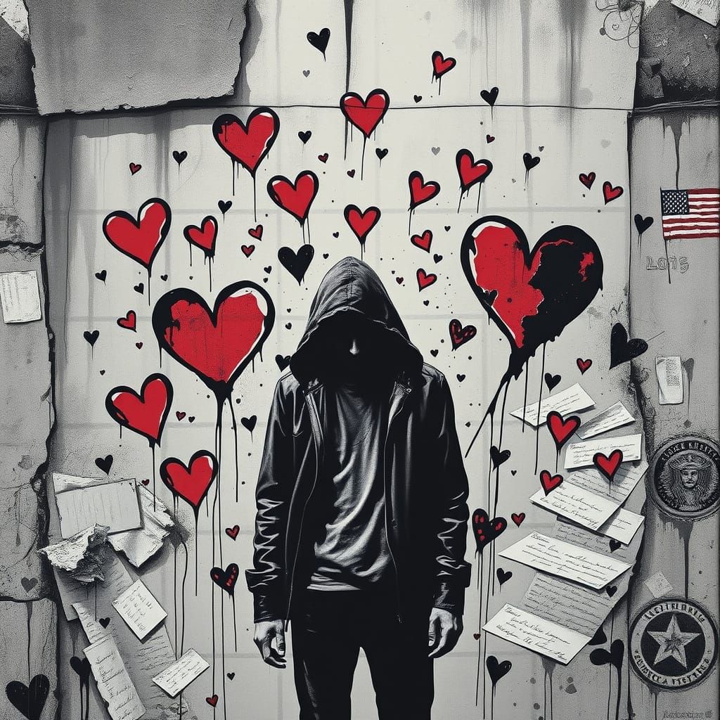 This image shows a solitary figure amidst crumbling walls and heart graffiti. The monochromatic urban scene evokes melancholy, with a street art aesthetic.