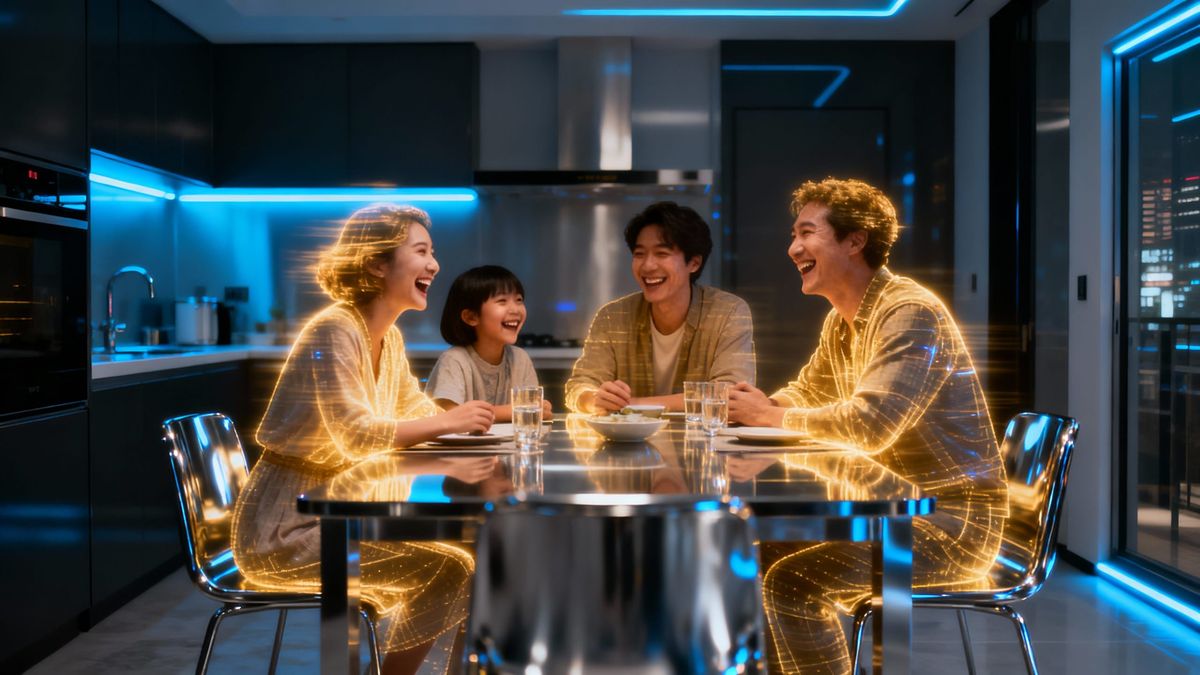 This image shows a flickering holographic projection of a family sharing a meal, set in a minimalist chrome apartment. Captured in a cinematic, photorealistic style with a nostalgic blur.