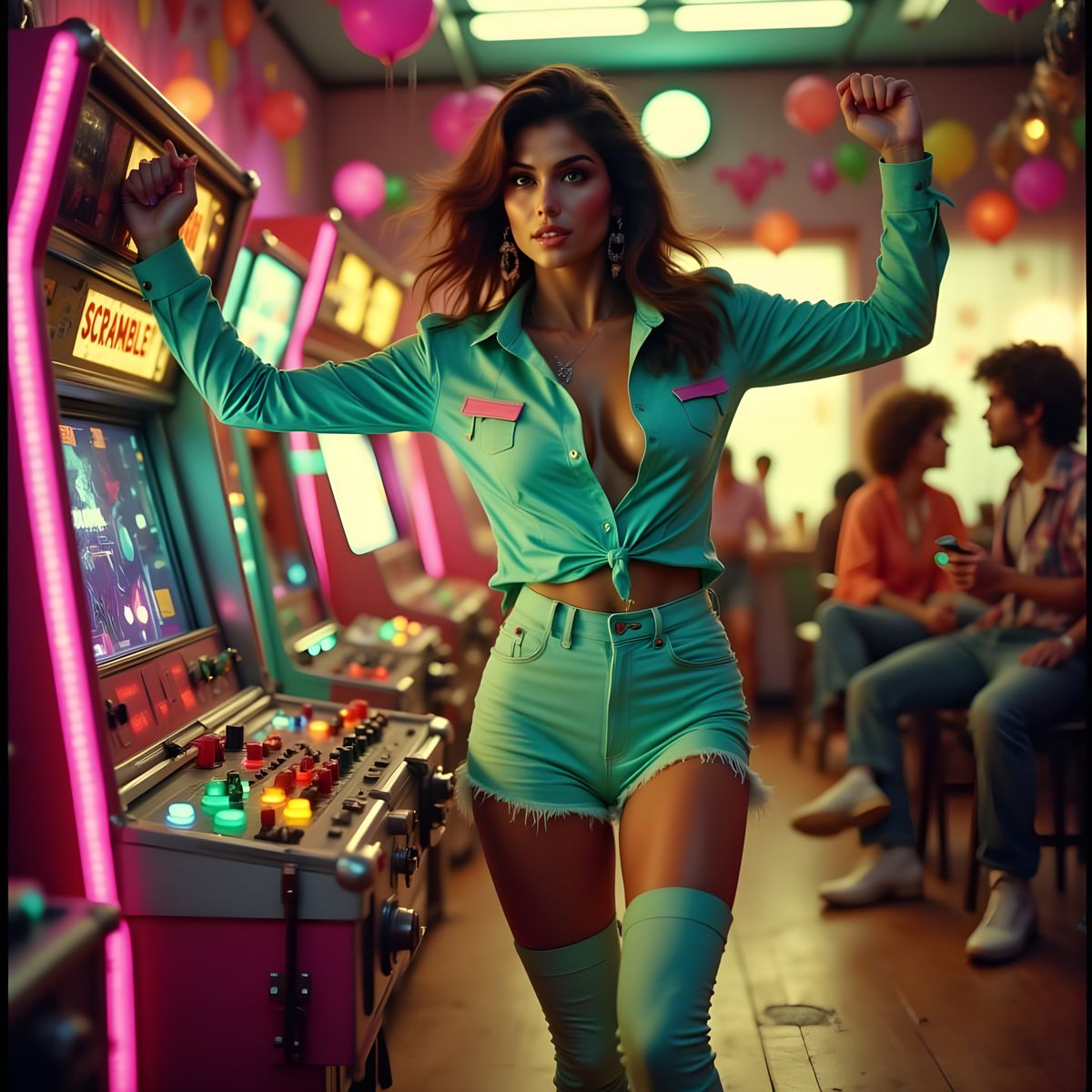 This image captures a teenage girl, inspired by 1980s fashion, dancing triumphantly in a video arcade. She wears a teal new wave dress and tan pantyhose, with vibrant colors and sharp details that evoke a sense of high-energy nostalgia.