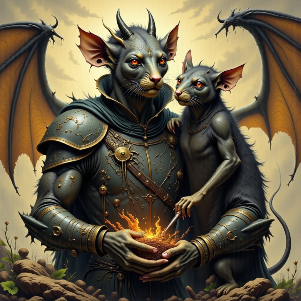 This image showcases a powerful gargoyle warrior standing alongside his loyal rat warrior companion. A unique pairing of fantasy creatures.