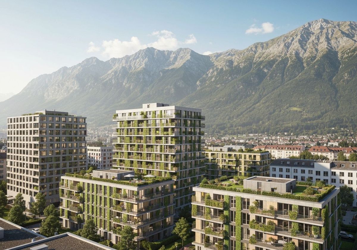 A hyperrealistic, cinematic view of a modern sustainable city in Innsbruck, Austria, featuring social housing, green rooftops, and facades against the Tyrolean mountains.