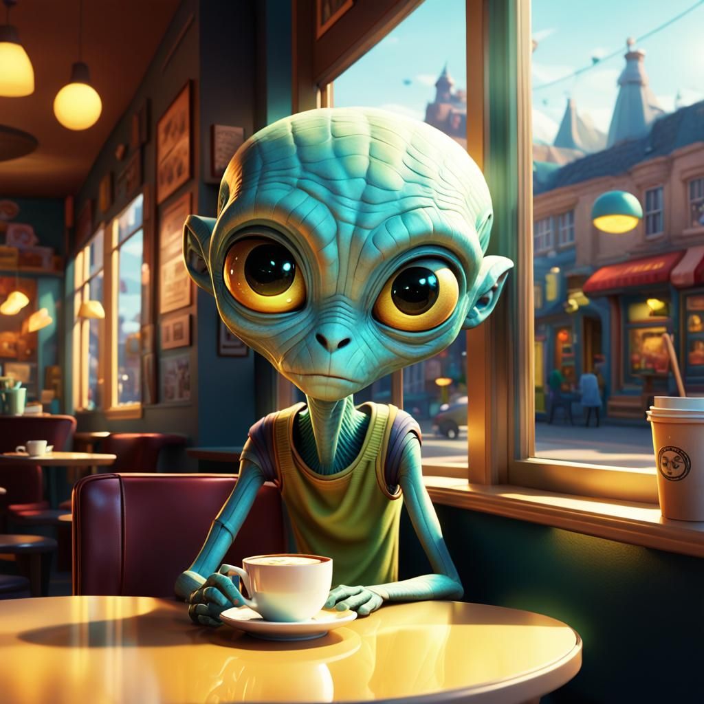 This image shows a cheerful alien peering into a quiet coffee shop. The vibrant, high-contrast digital art, reminiscent of Pixar and Steven Universe, features warm lighting and subtle shadows.