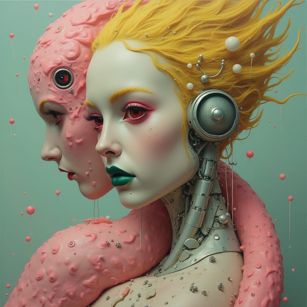 This image depicts a close-up of a bioluminescent cyborg swan with striking red eyes, green lips, and vibrant yellow hair, set against a melting oil canvas background, evoking a dreamlike atmosphere with intricate mechanical details.