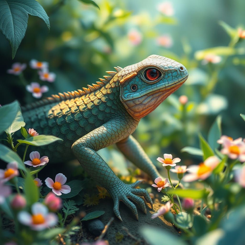 This image shows a close-up watercolor painting of a forest creature. The scaly lurker leaves a trail of wildflowers. The scales shimmer with iridescent colors and soft pastel hues. The image is detailed and fantastical.