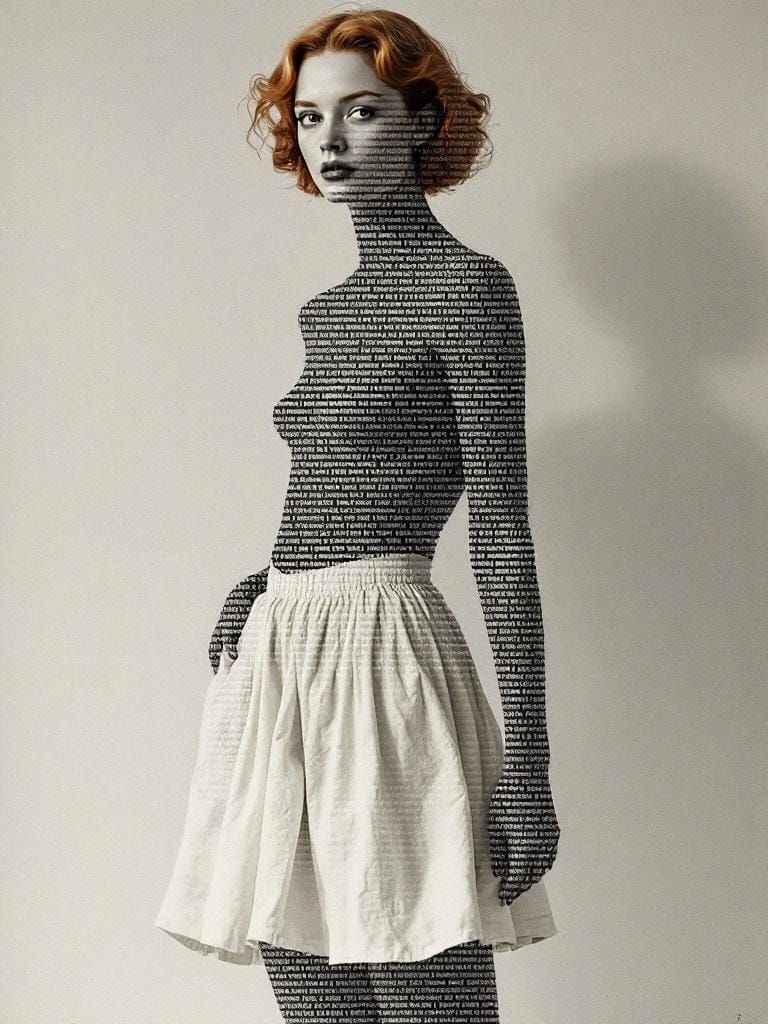 This image shows a portrait of a redhead in a 1950s-style figure study, overlaid with ASCII art. The digital overlay mimics underlying forms, creating a dual-layer depth in a computational aesthetic.