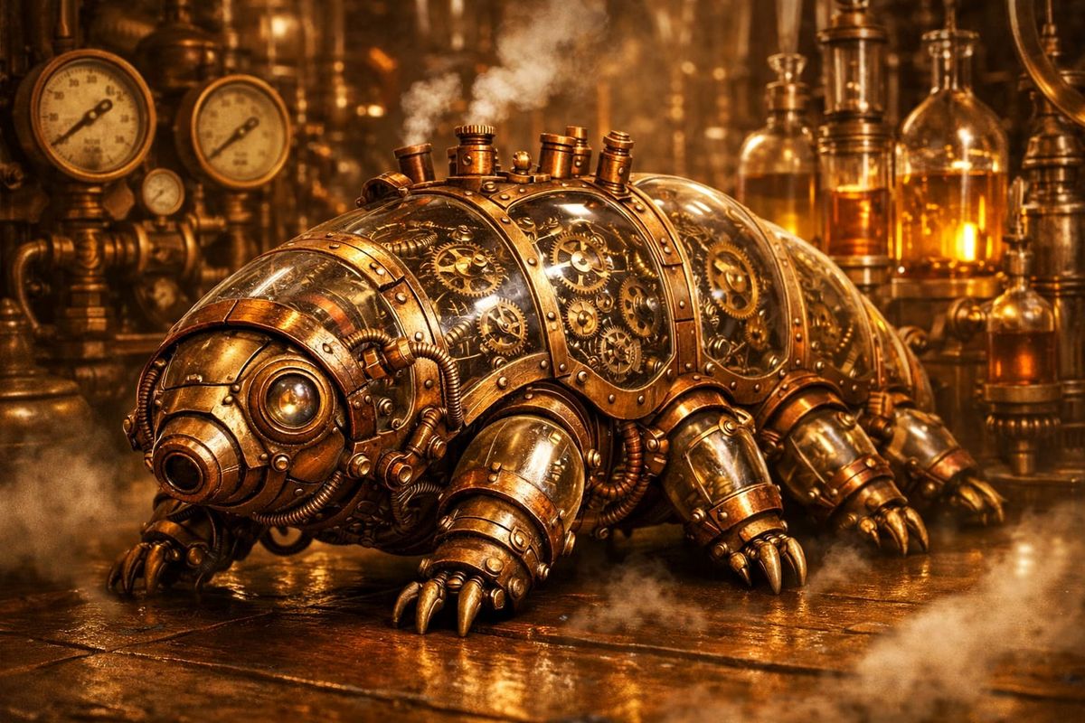 This image depicts a detailed steampunk tardigrade made of brass and copper, exploring a Victorian laboratory with intricate mechanical elements. Rendered in an illustrative concept art style with warm sepia tones and soft steam.