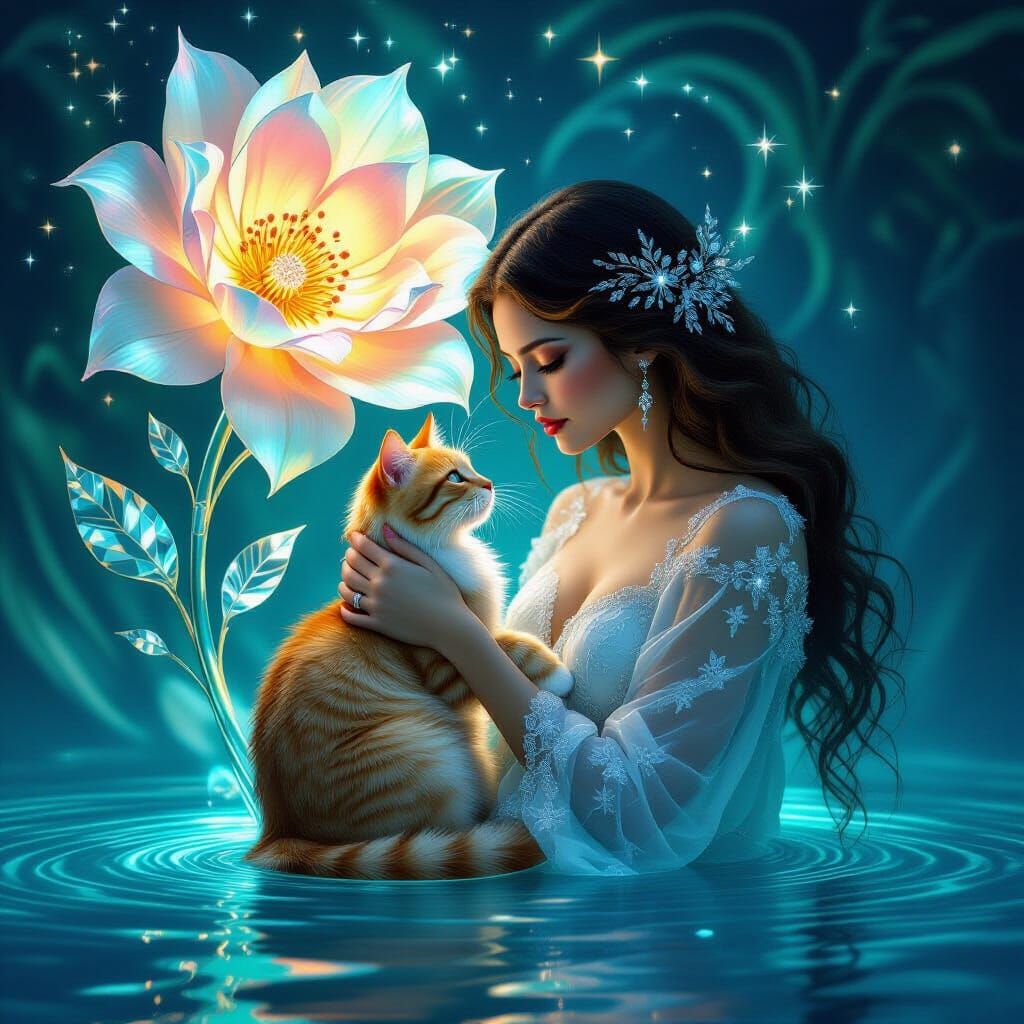 A striking image of a translucent woman holding a ginger cat. Her body reveals swirling watery light, entwined with stars and silver filigree, set beneath a large flower in a surreal collage style.