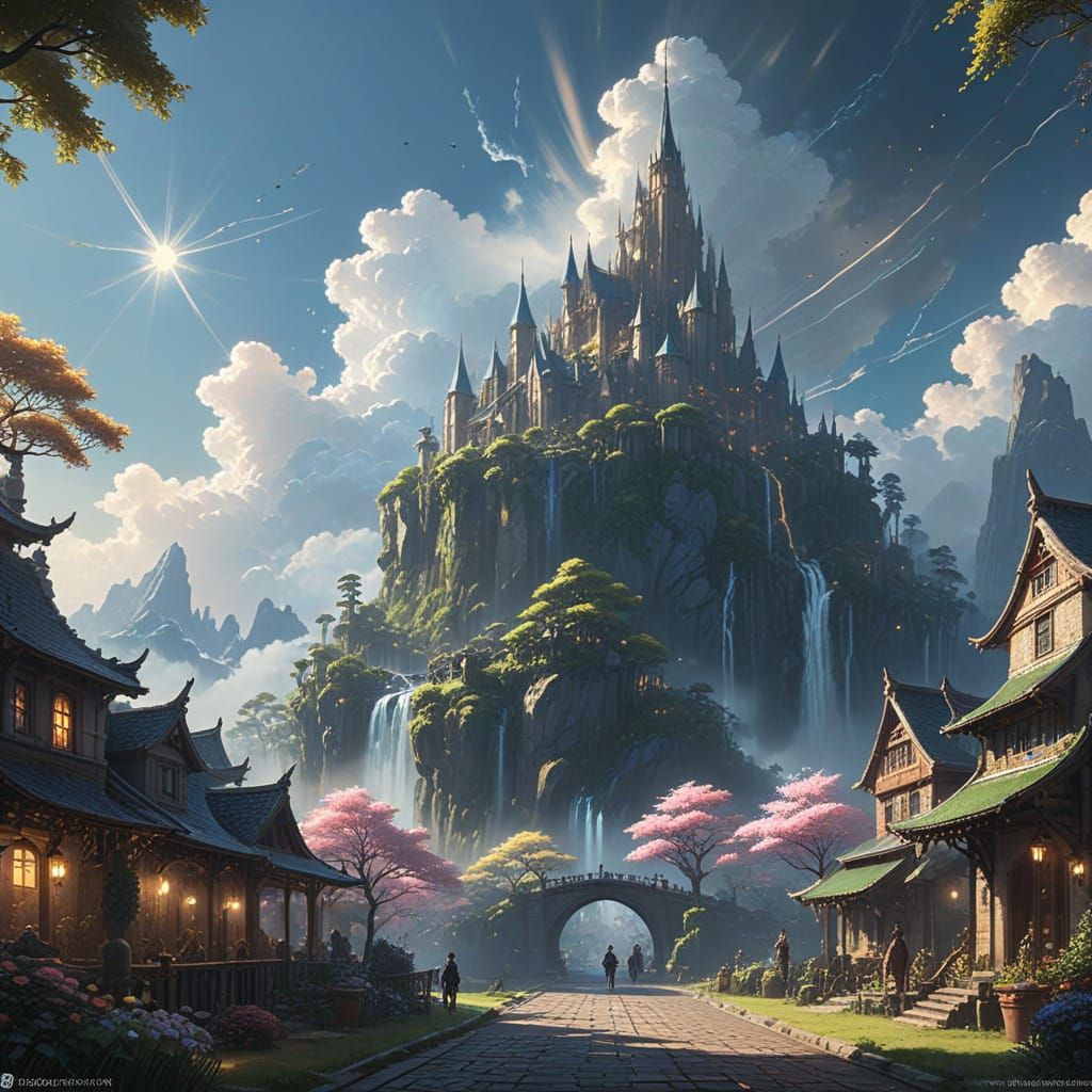 This stunning digital art piece depicts a futuristic cityscape in a solar punk utopia, where vibrant colors and fantastical elements blend with natural and floral motifs. The city shines with metallic accents and intricate details, set against a breathtaking sky with divine sunlight and soft focus.