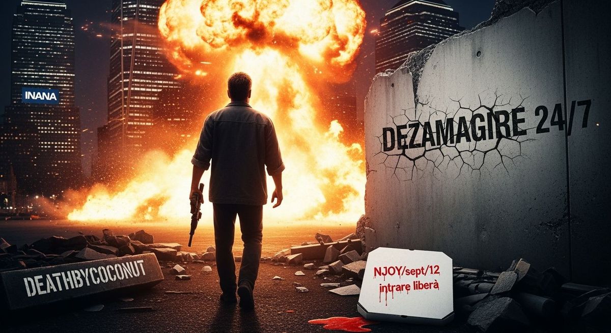 This image depicts a gritty action scene reminiscent of 1980s cinematic style. An explosion engulfs skyscrapers as the hero walks away. The scene incorporates high contrast, film grain, and dramatic lighting.