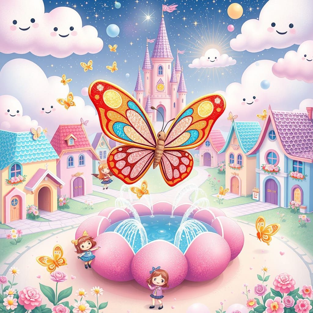 A vibrant image of a kawaii-style magical town. Pastel houses, smiling clouds, and floating sparkles fill the scene, with a large glittery butterfly on a flower fountain.