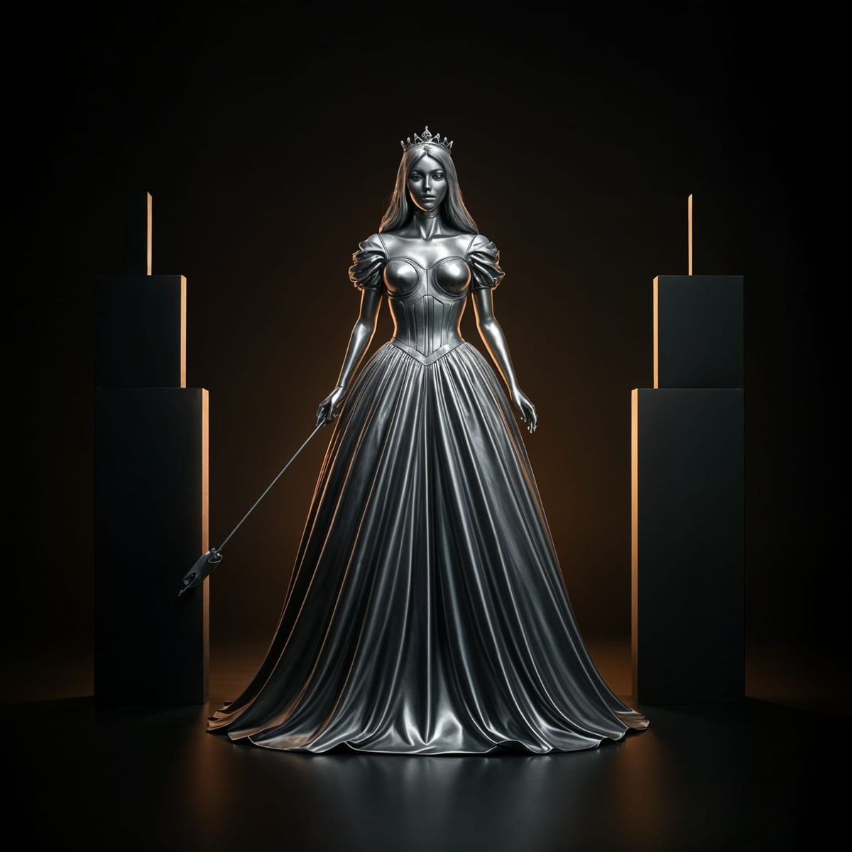 A minimalist, surreal sculpture of a princess in a silver shadow, created with an optical illusion effect, featuring an obscure and dreamlike atmosphere