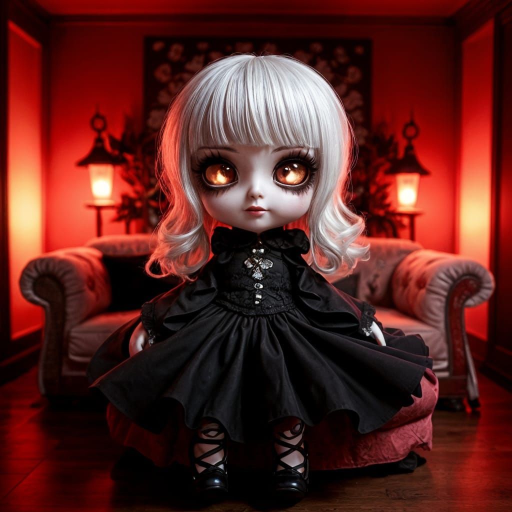 A haunting image of an albino doll with white curls, red eyes, and black ribbons in her hair, wearing a black lace dress, set in a red room with volumetric lighting. The artwork embodies a creepy gothic aesthetic.
