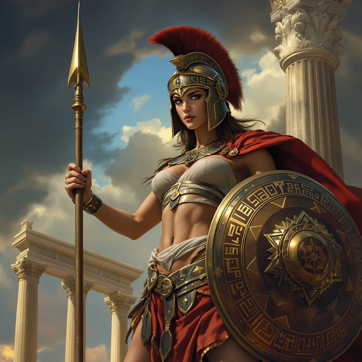 This image depicts a fit ancient Greek warrior woman with a spear and shield against a dramatic sky with temple pillars. Rendered with elegant lines and vibrant colors.