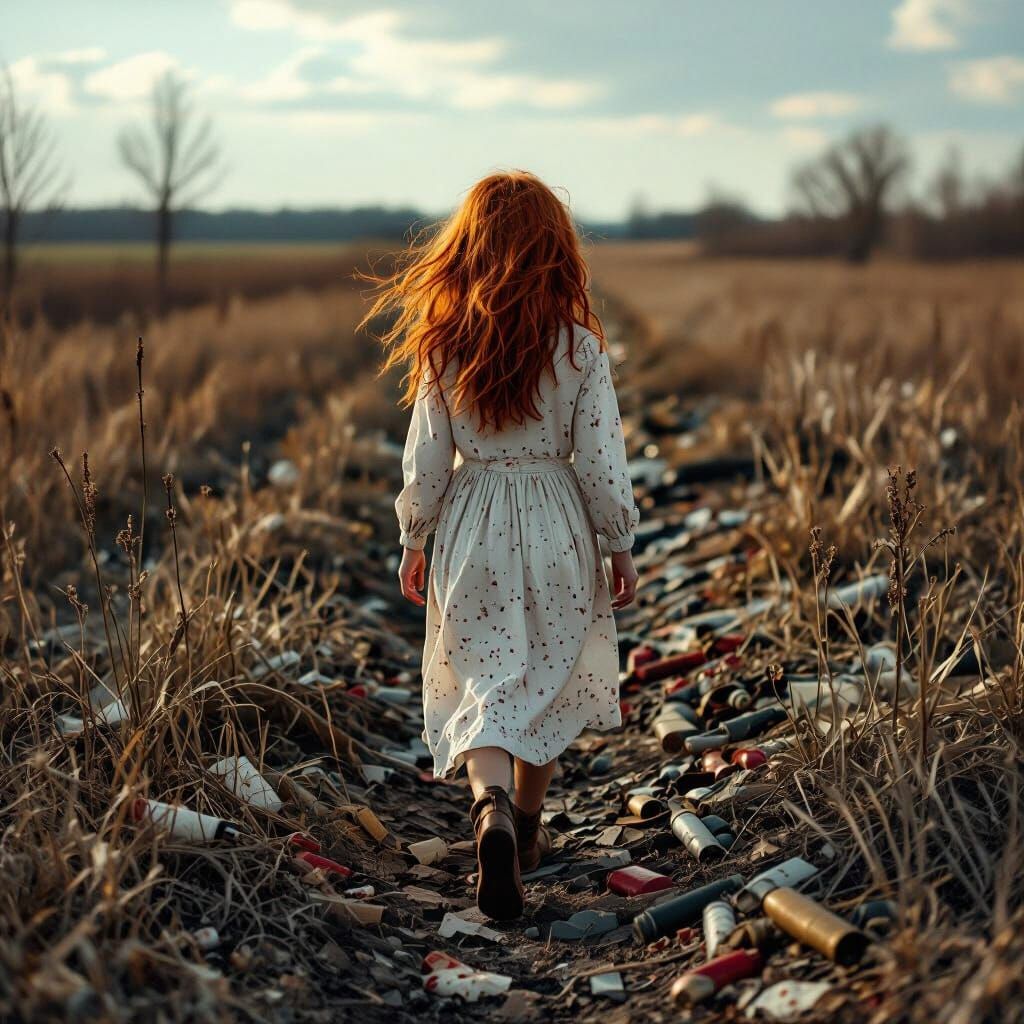A striking cinematic film still captures a red-haired girl traversing a desolate field strewn with wartime remnants. High-resolution, atmospheric, and epic.