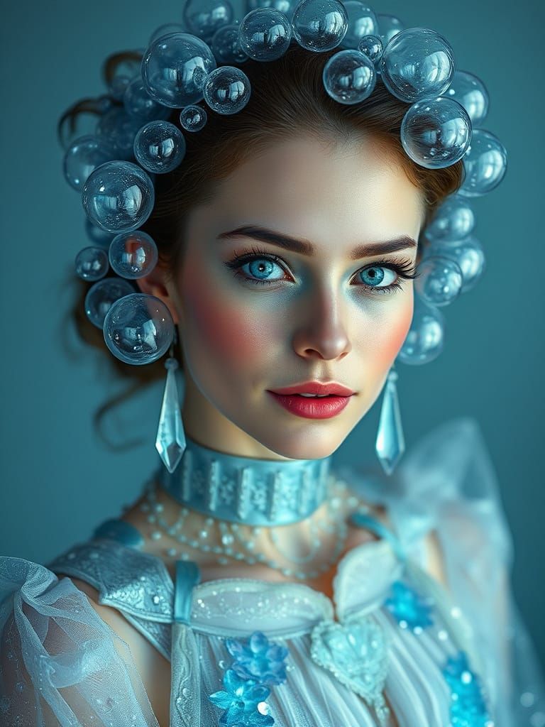A mesmerizing portrait of a woman seemingly formed from iridescent bubbles. Her luminous skin and bright eyes create an ethereal, dreamy aesthetic as 3D rendered digital art.