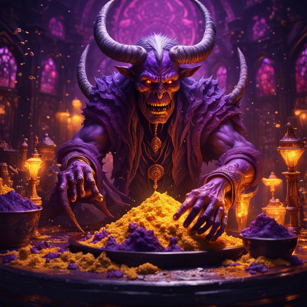 A striking picture of a demon made of cocaine. The demon is depicted with dynamic lighting and intricate details, presented as dark fantasy concept art with purple and yellow complementary colours.