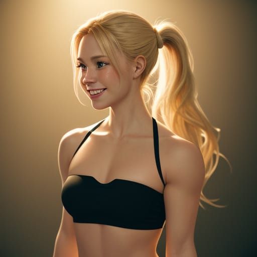 This image shows a young, smiling gymnast with rosy cheeks and a blonde ponytail in a medium shot. Captured with film grain and golden hour hues, it evokes a dramatic, cinematic feel.