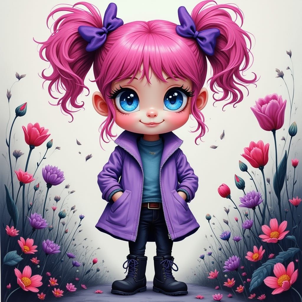 This image features a happy, whimsical girl caricature with bright blue eyes and messy pink pigtails. Rendered in a vibrant graffiti art style with melting oil effects.