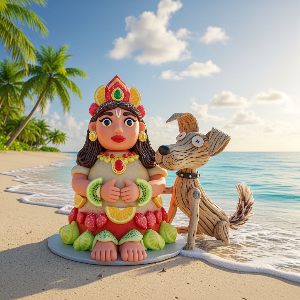 This image shows an elaborate marzipan idol decorated with fruit, sitting on a beach next to a driftwood dog sculpture. The idyllic island scene is bathed in the warm glow of a sunset.