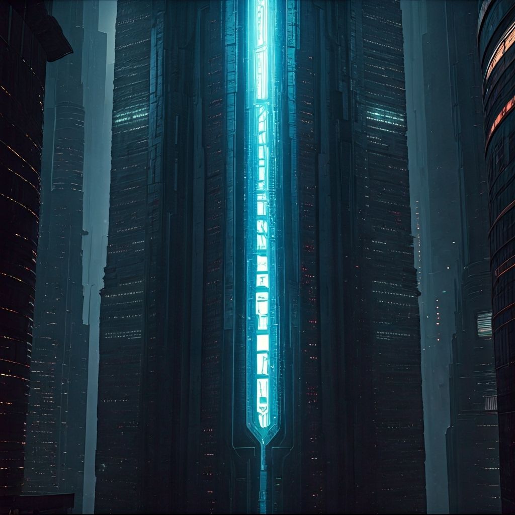 This image shows a gleaming spire in a futuristic cityscape. The scene features sleek skyscrapers, streets illuminated by neon lights, and dancing holograms in a sci-fi fantasy aesthetic. Rendered as a detailed matte painting.